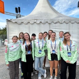 10 Mädchen des Teams übernahmen zudem das Zielcatchen. Sie fingen im Zielbereich jeweils die drei Erstplatzierten in den verschiedenen Wettbewerben ein, begleiteten sie zu den Siegerehrungen und betreuten sie teilweise auch auf dem Weg in deren Hotel. Diese sehr interessante und spannende Aufgabe wurde von allen mit großem Einsatz bewältigt. Von den Athleten und den Organisatoren erhielt unser Team auch in diesem Jahr viel Lob und Anerkennung.