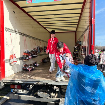 Um 07.30 Uhr begannen die LKW-Teams bei Sonnenschein, aber recht frischen Temperaturen, mit ihren Vorbereitungen auf den Ladeflächen der 13 Höffi‘s. Ab 08.00 Uhr konnten sie dann mit dem Verstauen der ca. 4500 Kleiderbeutel beginnen.