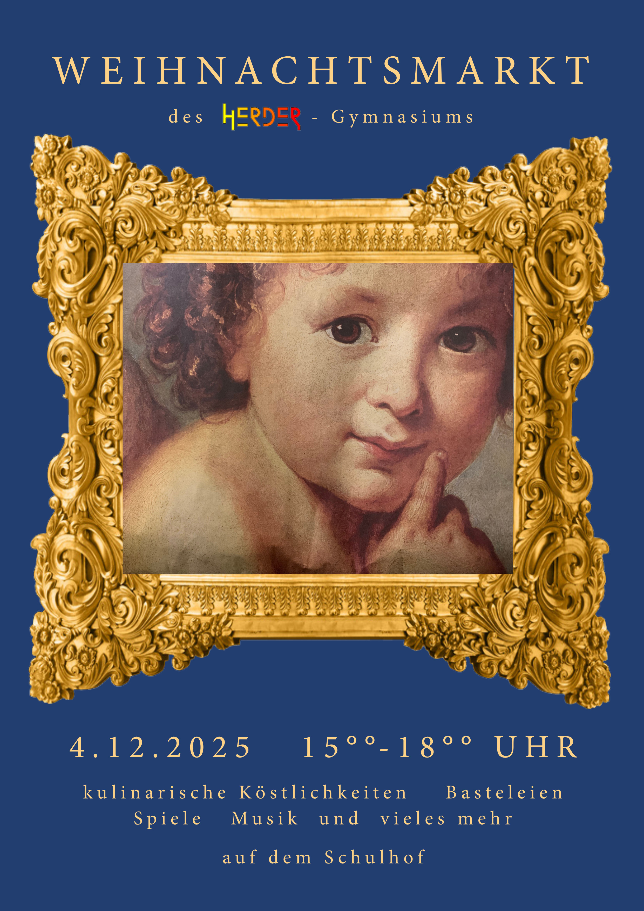 Am 4. Dezember um 15:00 findet unser Weihnachtsmarkt auf dem Schulhof statt. Kommen Sie vorbei, um sich bei Leckereien, Musik und toller Atmosphäre zu amüsieren.