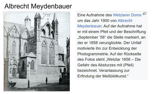 Besonders nachvollziehbar ist in diesem Zusammenhang eine historische Aufnahme des Wetzlarer Doms. Meydenbauer markierte dort später die Stelle, an der er 1858 bei Vermessungsarbeiten beinahe abgestürzt wäre. Dieses Erlebnis führte für ihn zu der zentralen Frage, ob Vermessung auch aus der Distanz möglich sein könnte – ohne das Risiko direkter körperlicher Gefahren.