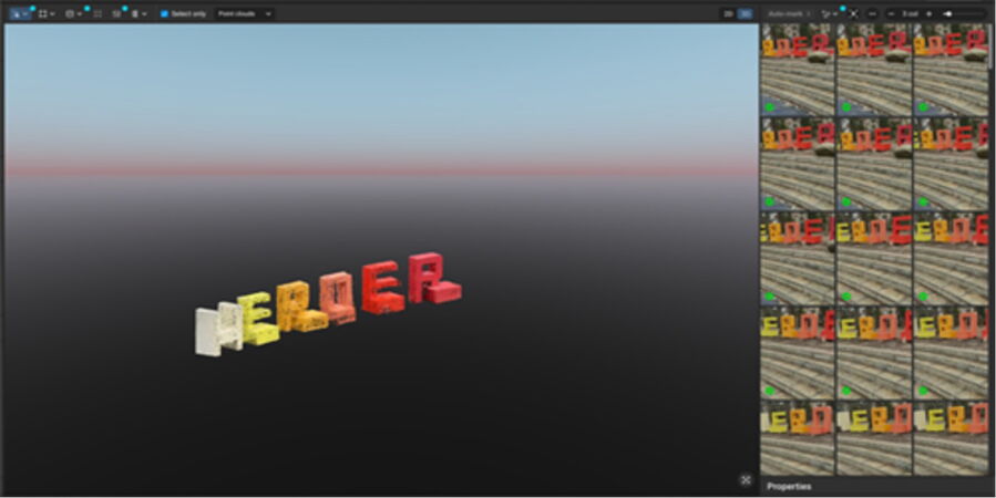 Auf dieser Grundlage werden die Bilder zueinander in Beziehung gesetzt: Die Positionen der Kameras im Raum werden rekonstruiert, Blickrichtungen berechnet und die Lage der erfassten Punkte trianguliert. Schritt für Schritt entsteht so aus zweidimensionalen Einzelaufnahmen ein dichtes räumliches Punktfeld (Punktwolke), das schließlich zu einem vollständigen 3D-Modell verdichtet wird.