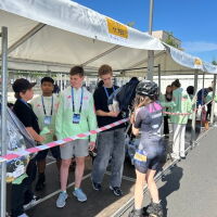 10 Mädchen des Teams übernahmen zudem das Zielcatchen. Sie fingen im Zielbereich jeweils die drei Erstplatzierten in den verschiedenen Wettbewerben ein, begleiteten sie zu den Siegerehrungen und betreuten sie teilweise auch auf dem Weg in deren Hotel. Diese sehr interessante und spannende Aufgabe wurde von allen mit großem Einsatz bewältigt. Von den Athleten und den Organisatoren erhielt unser Team auch in diesem Jahr viel Lob und Anerkennung.