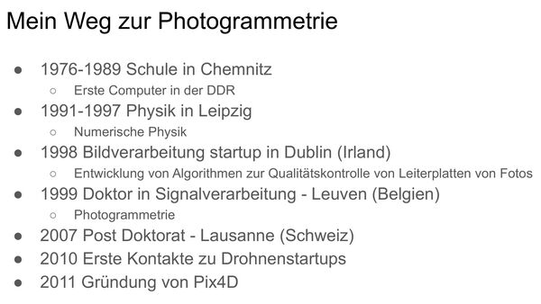 Im zweiten Teil des Vortrags berichtete Dr. Strecha von seinem Werdegang. Nachgezeichnet wurde ein Weg, der von der Schulzeit in Chemnitz über das Physikstudium in Leipzig zu internationalen Stationen in Dublin, Leuven und Lausanne führte – ein Weg geprägt von Interesse, Forschung und Unternehmertum.