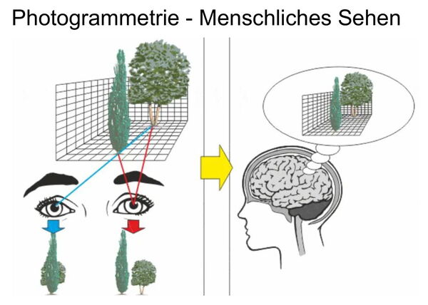Photogrammetrie nutzt ein Prinzip, das dem menschlichen räumlichen Sehen verwandt ist: Aus verschiedenen Blickwinkeln ergibt sich ein Modell des Raums.